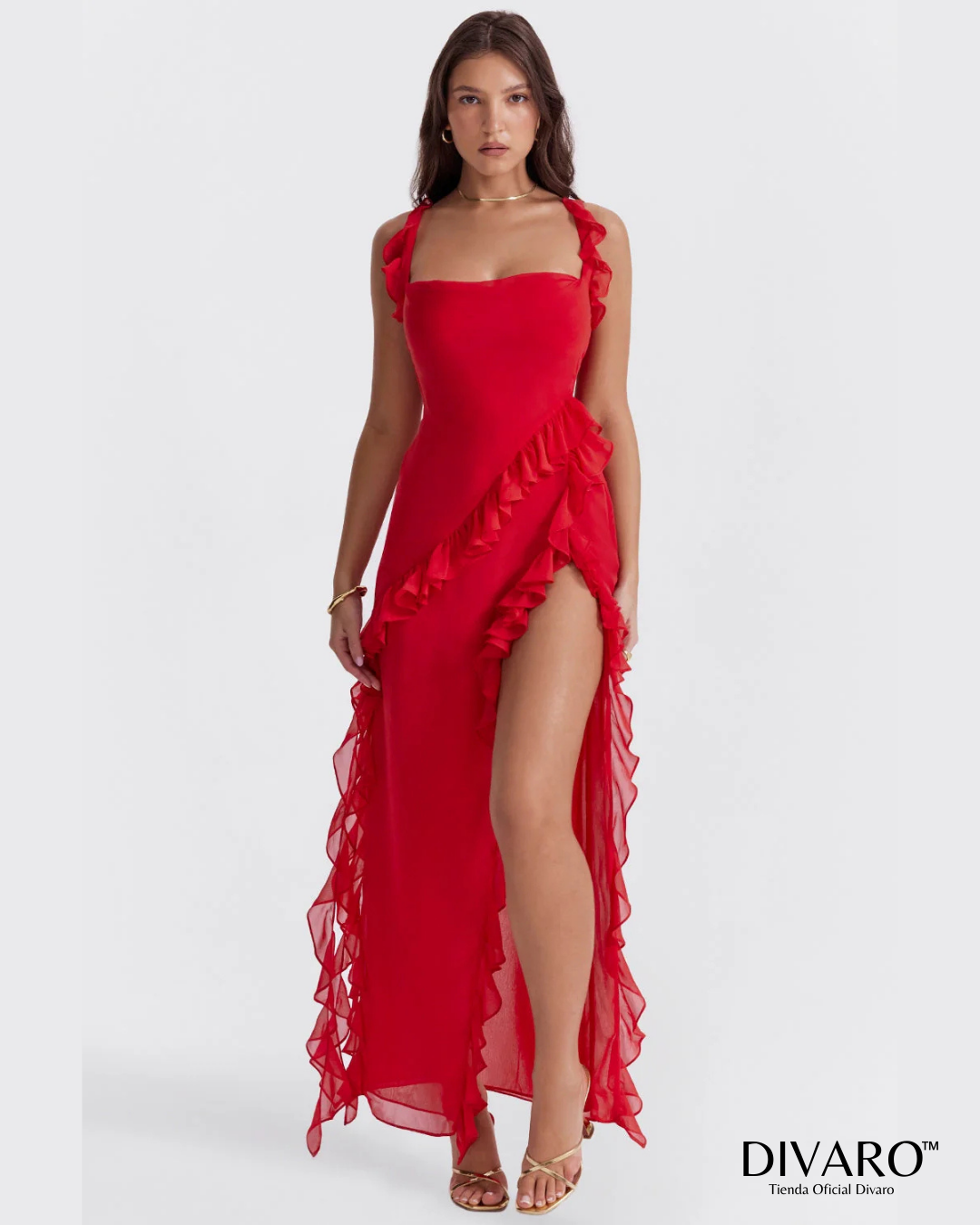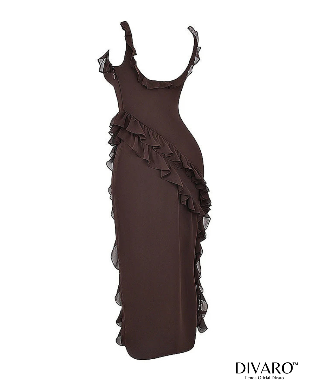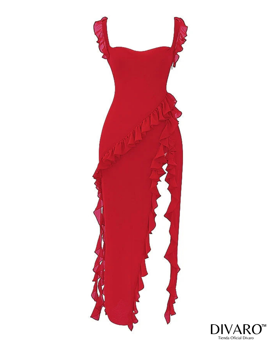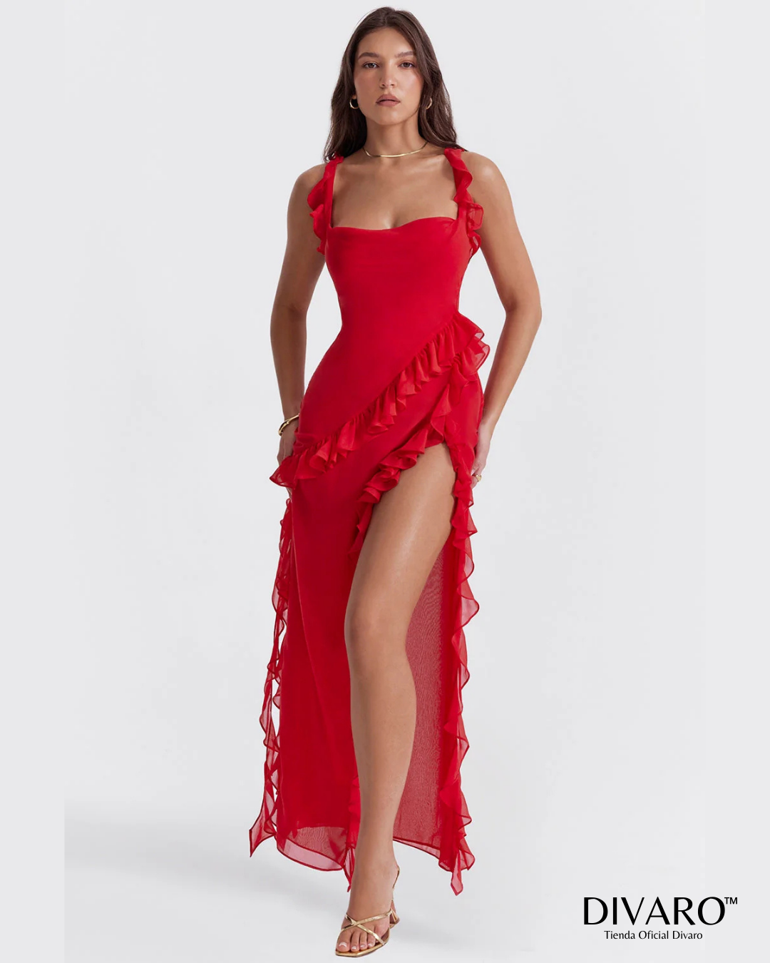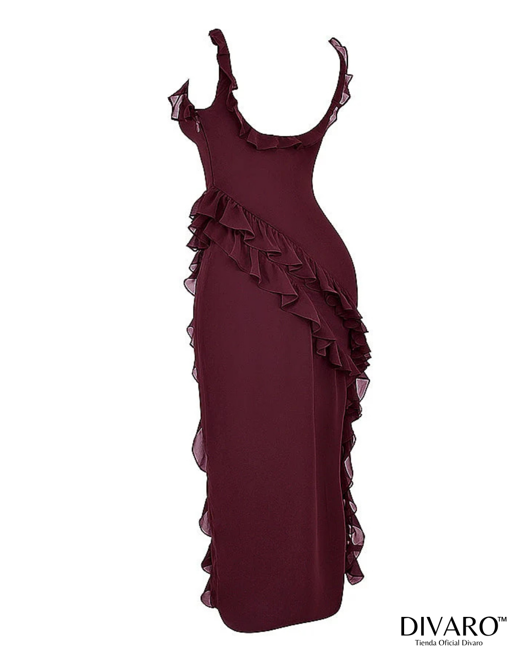 Descubre Elena, nuestro vestido largo con olanes. Su diseño ceñido se ajusta a la perfección a tu figura realzando tus curvas, mientras que los olanes añaden movimiento a tu look.