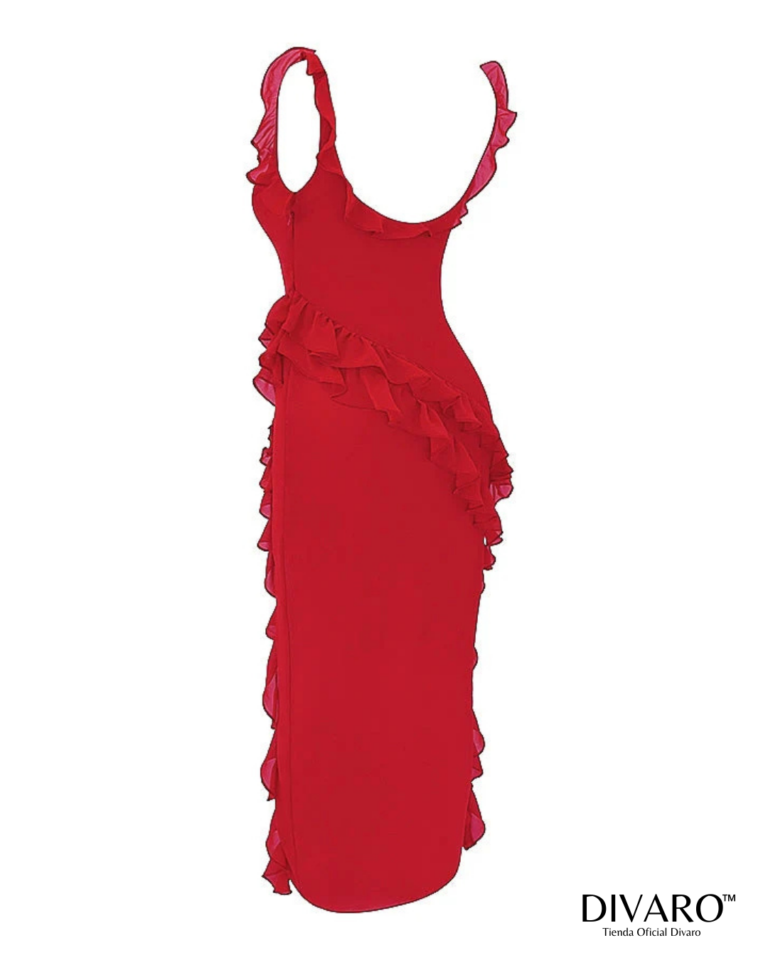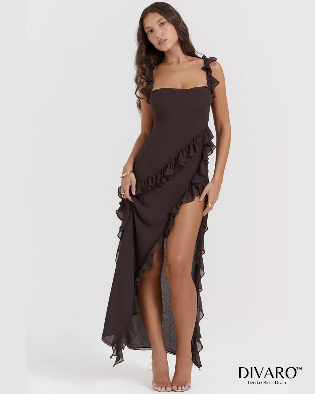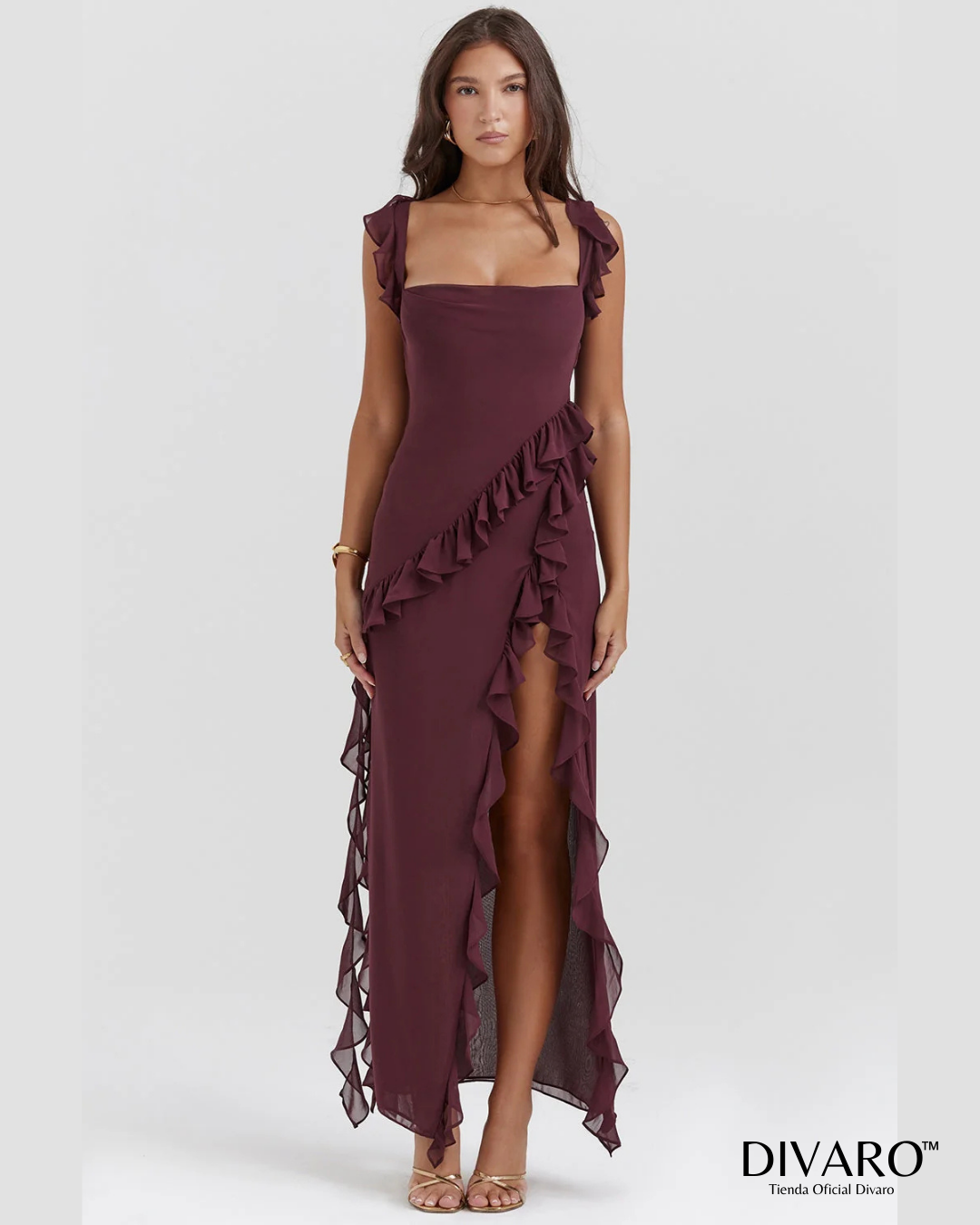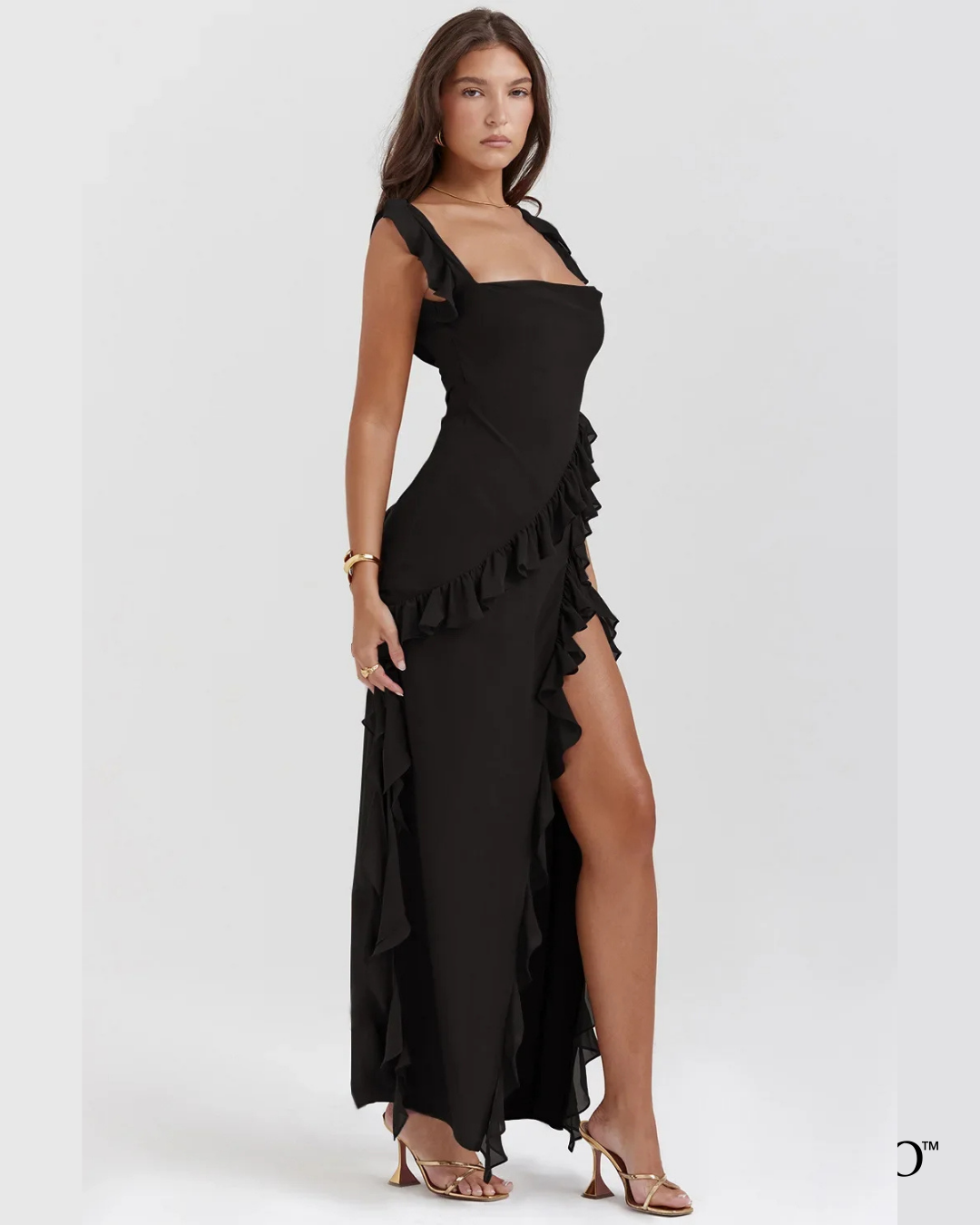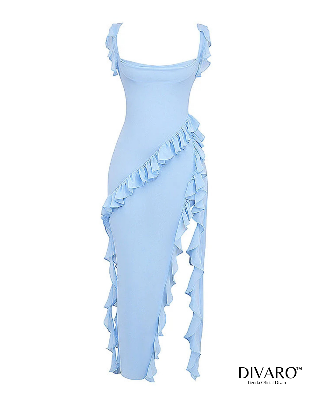 Descubre Elena, nuestro vestido largo con olanes. Su diseño ceñido se ajusta a la perfección a tu figura realzando tus curvas, mientras que los olanes añaden movimiento a tu look.
