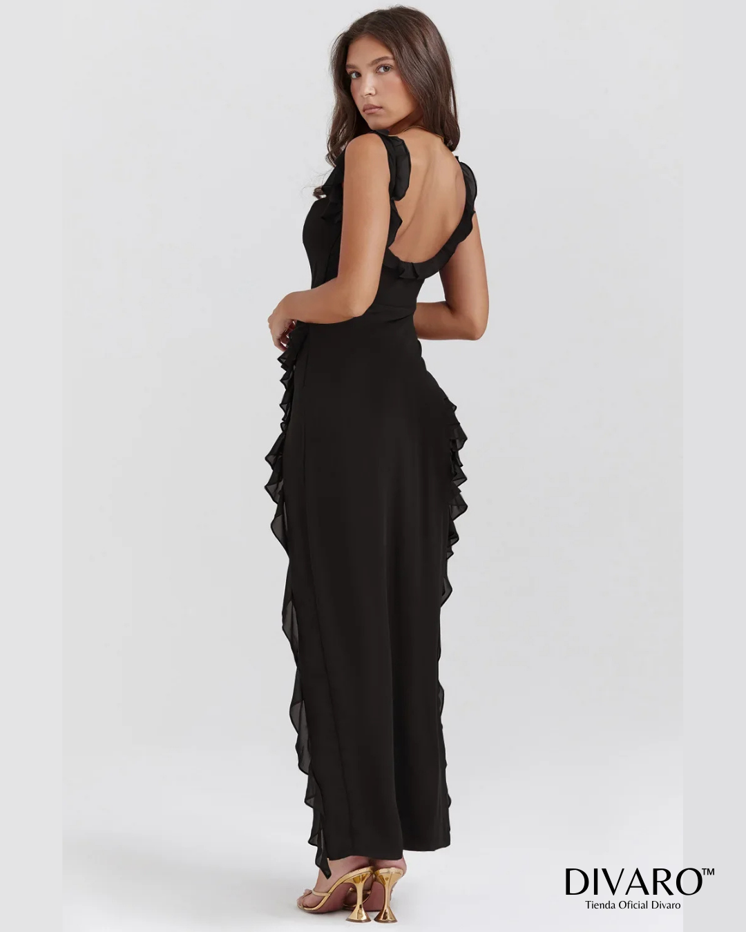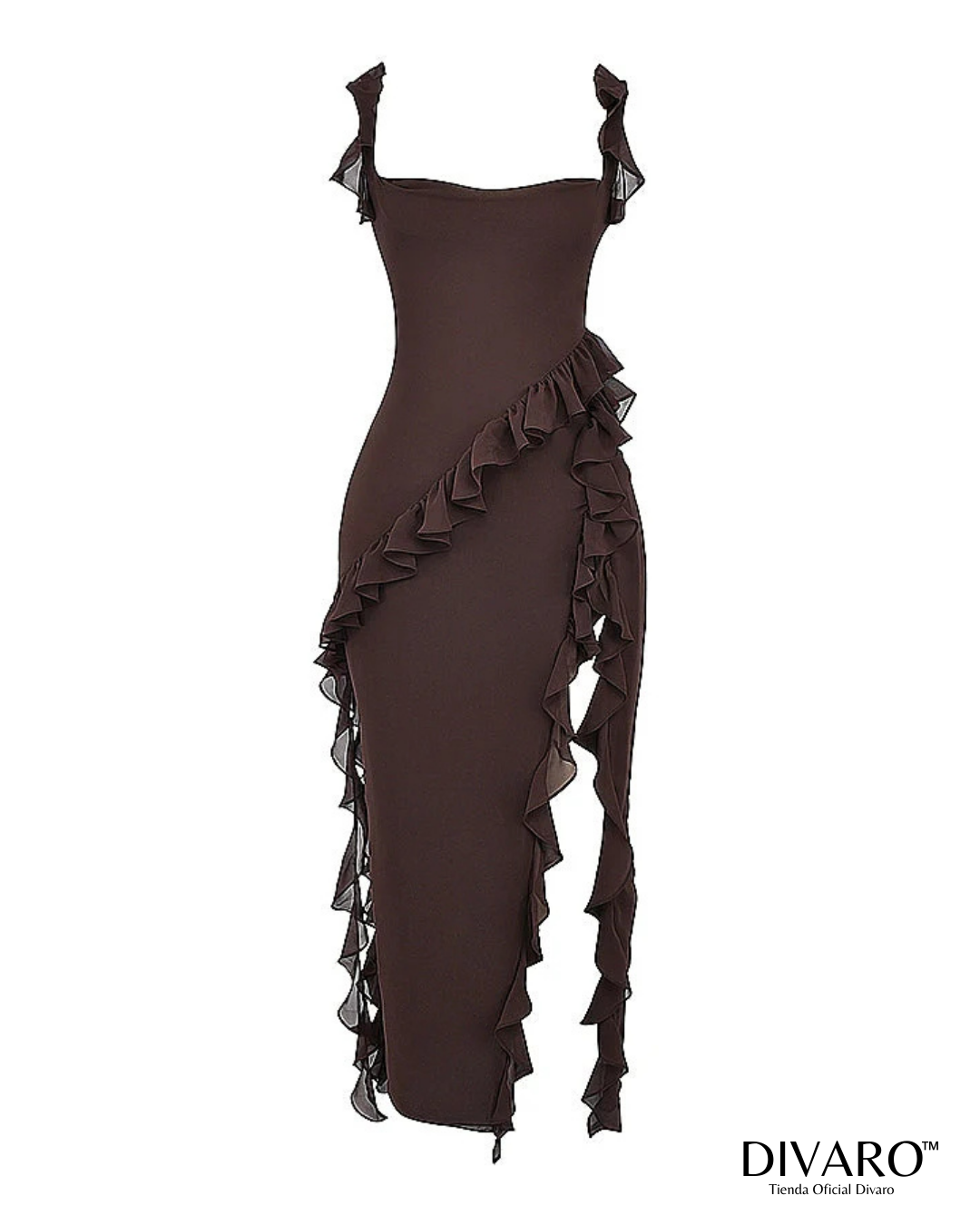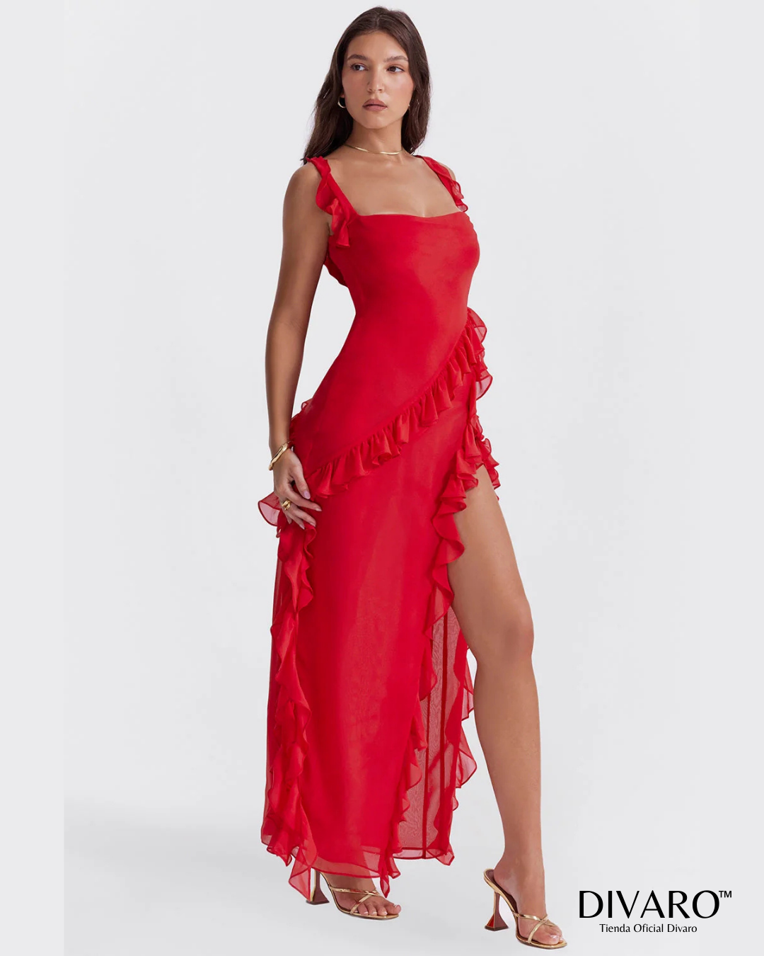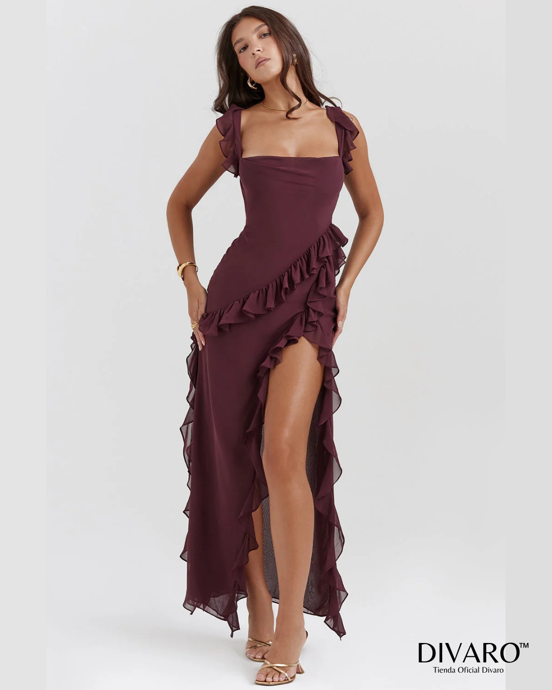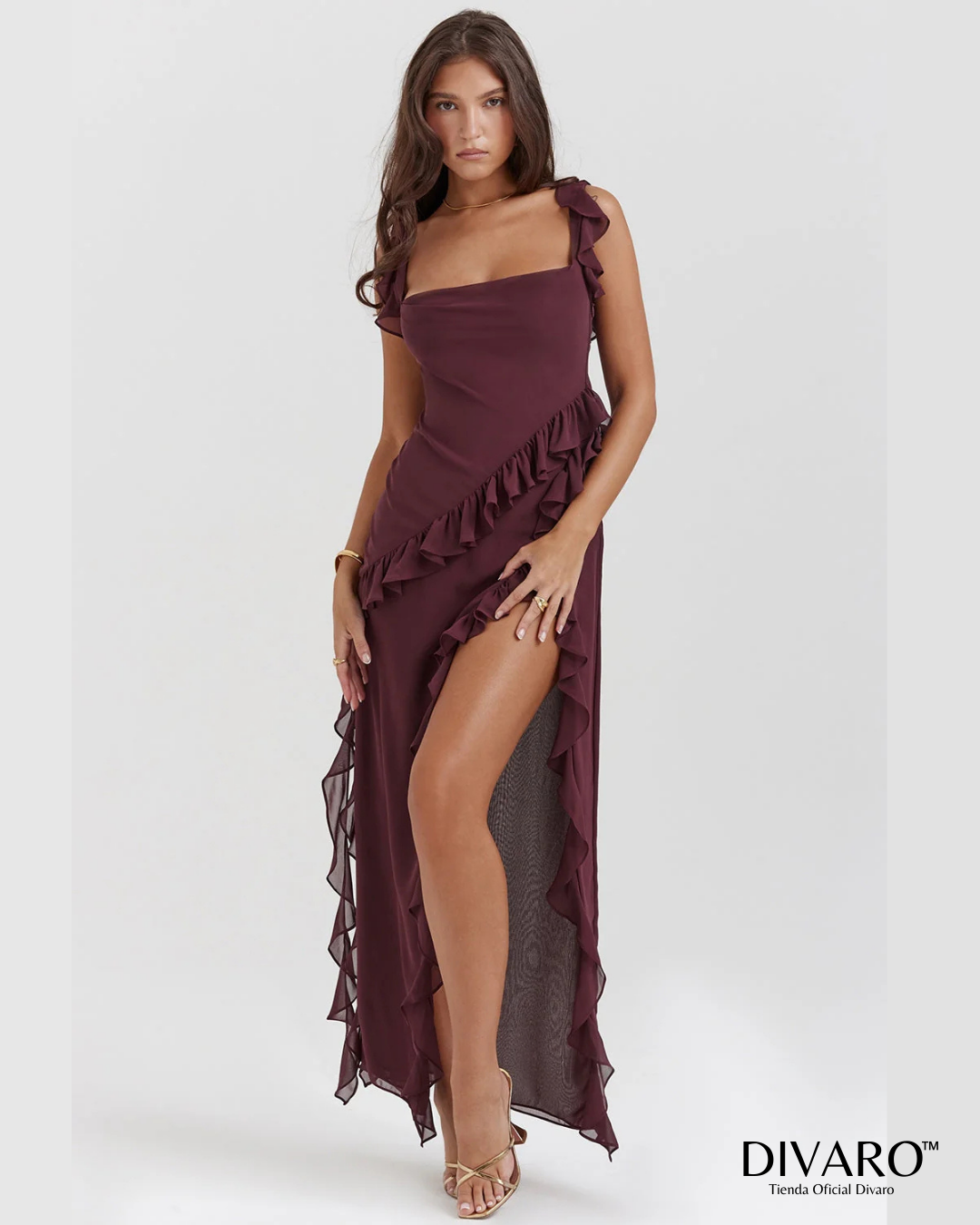 Descubre Elena, nuestro vestido largo con olanes. Su diseño ceñido se ajusta a la perfección a tu figura realzando tus curvas, mientras que los olanes añaden movimiento a tu look.