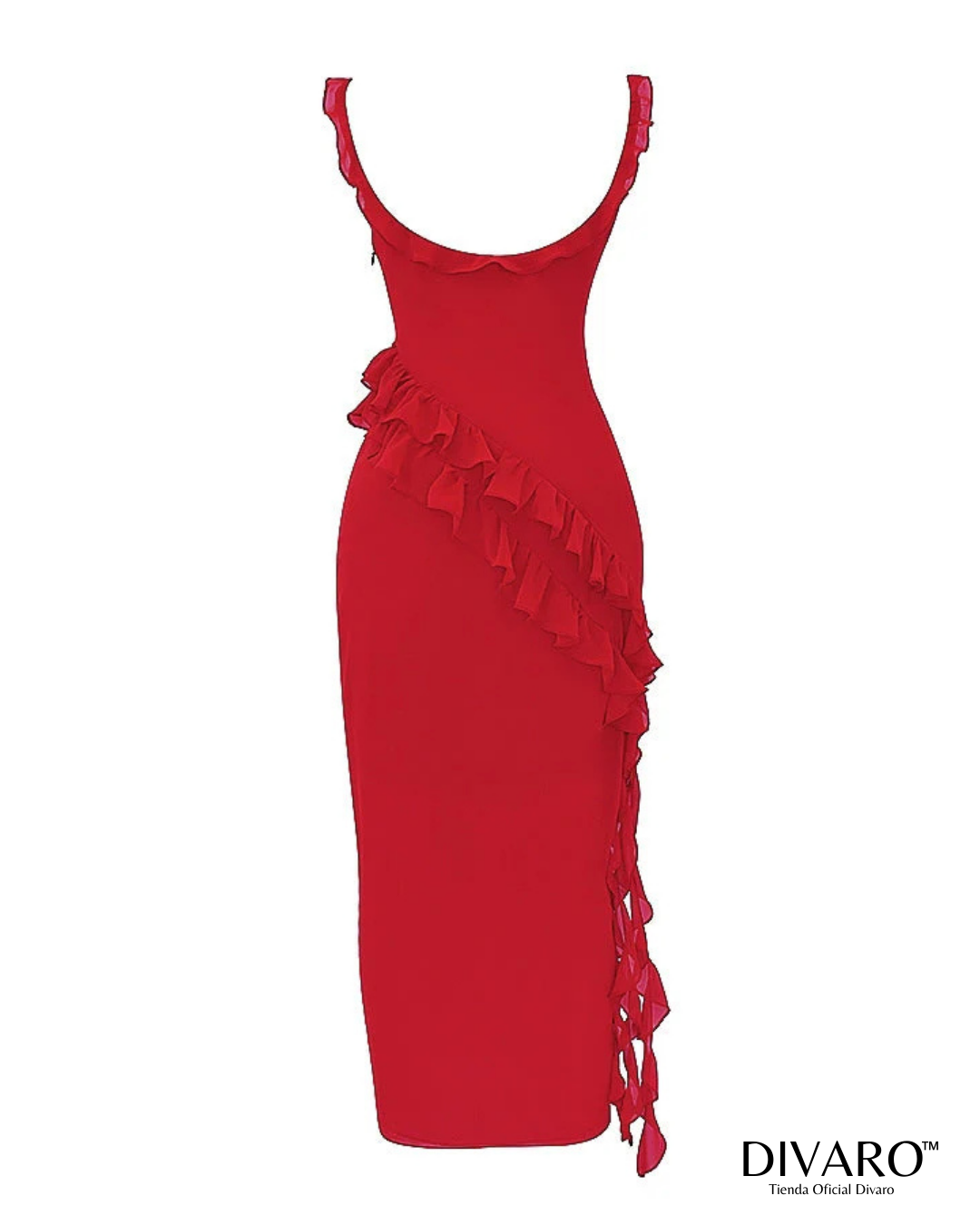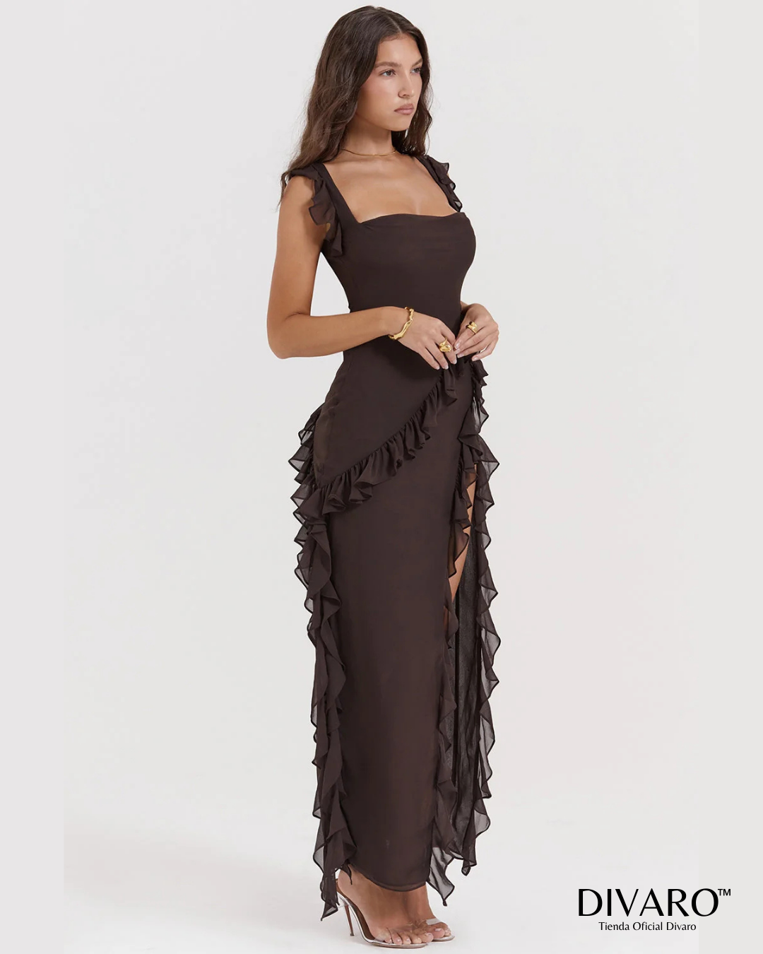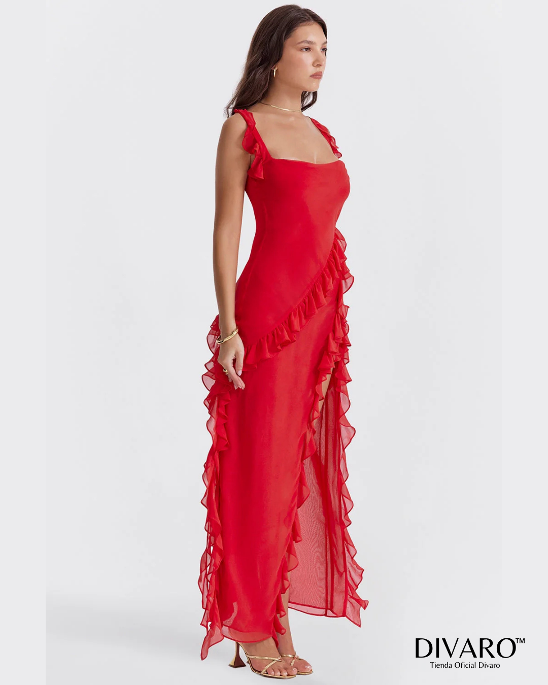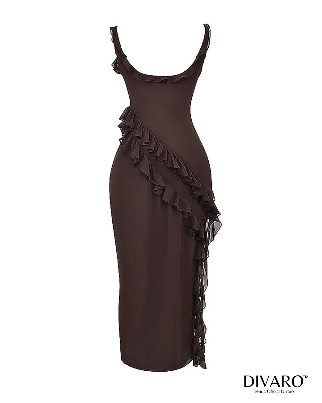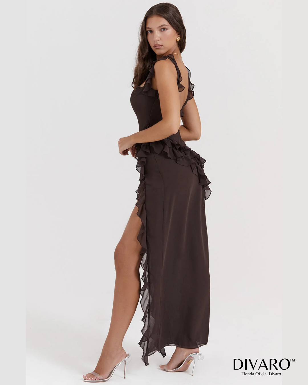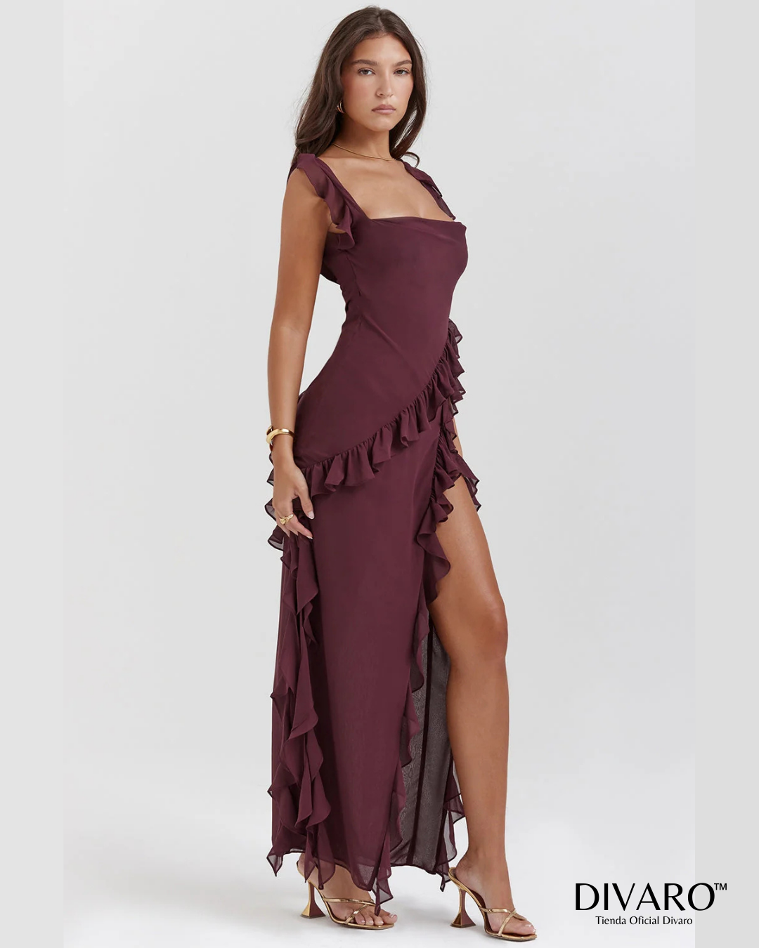 Descubre Elena, nuestro vestido largo con olanes. Su diseño ceñido se ajusta a la perfección a tu figura realzando tus curvas, mientras que los olanes añaden movimiento a tu look.