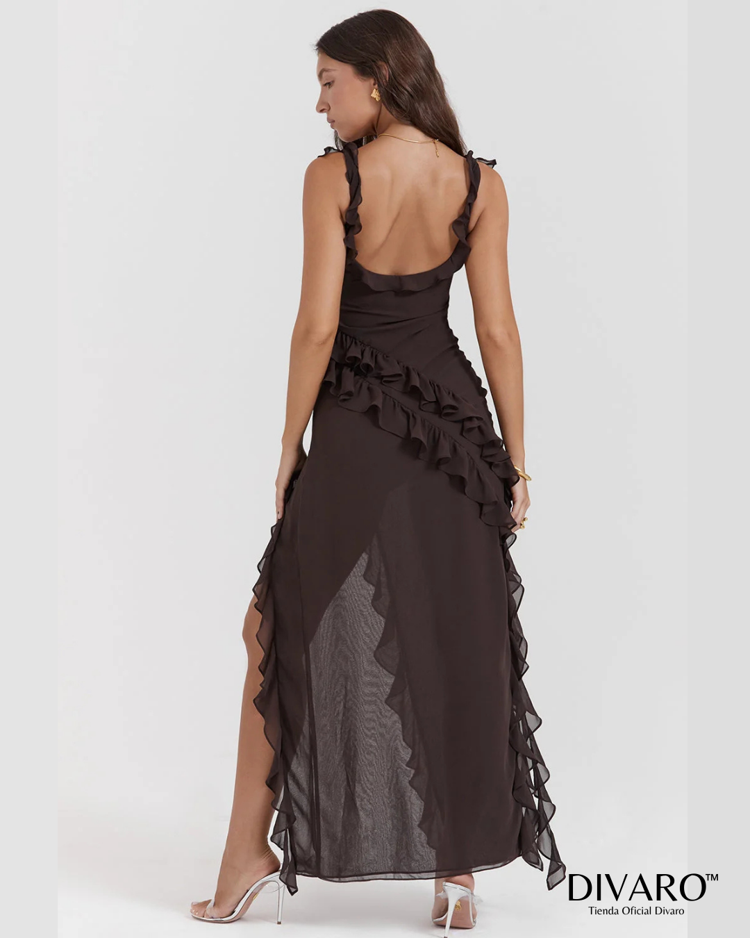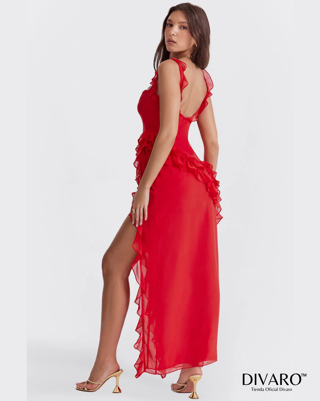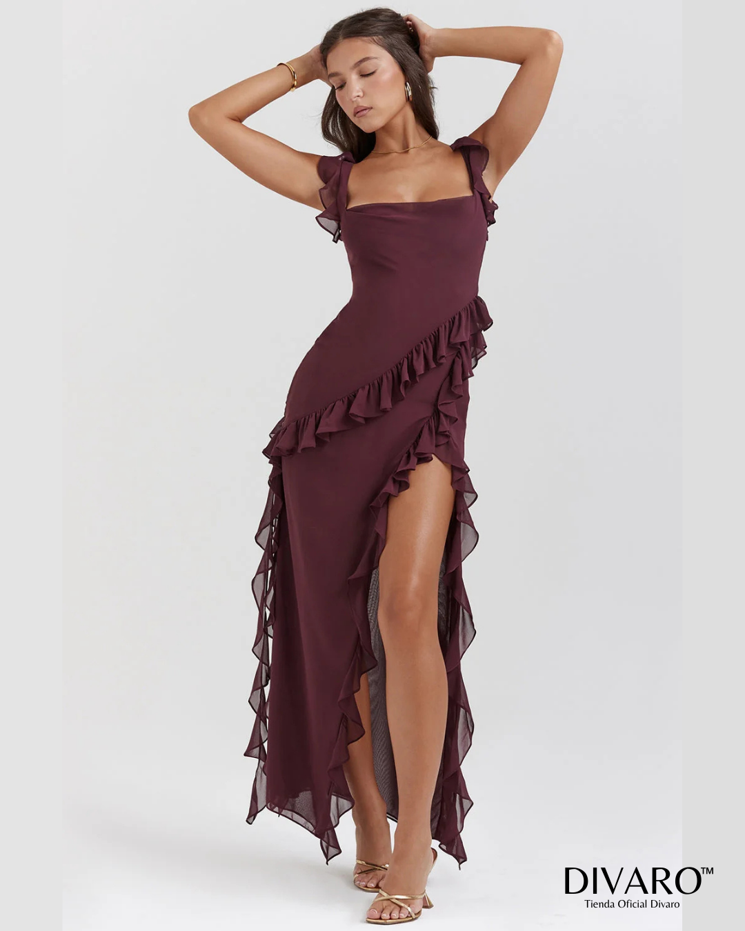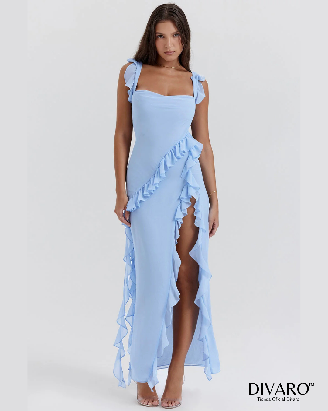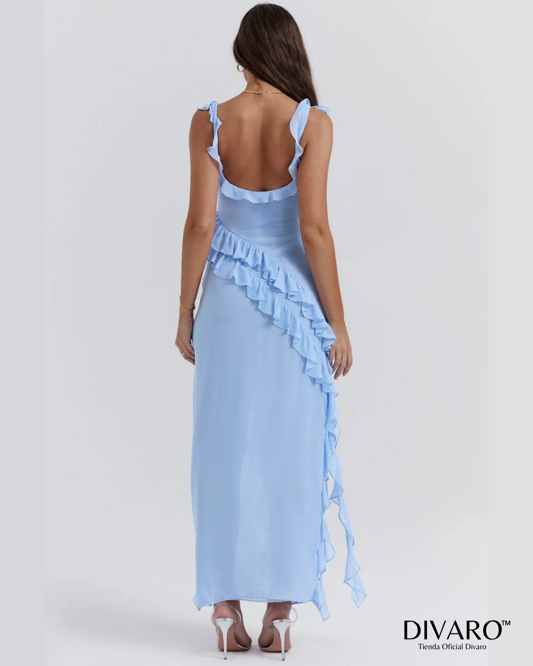 Descubre Elena, nuestro vestido largo con olanes. Su diseño ceñido se ajusta a la perfección a tu figura realzando tus curvas, mientras que los olanes añaden movimiento a tu look.