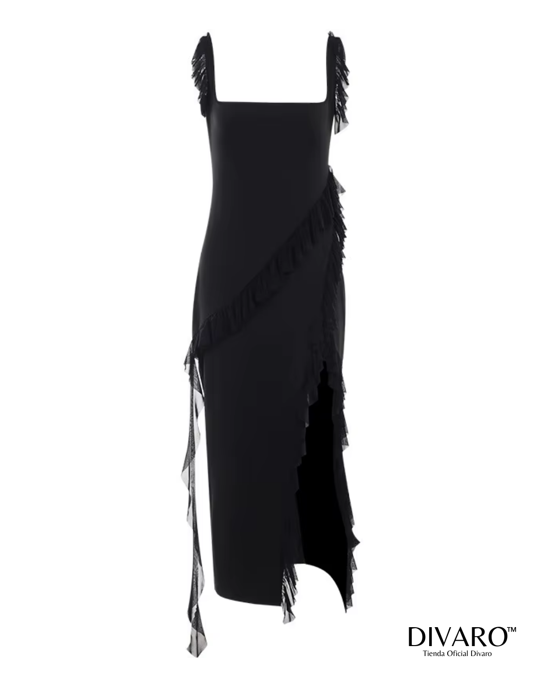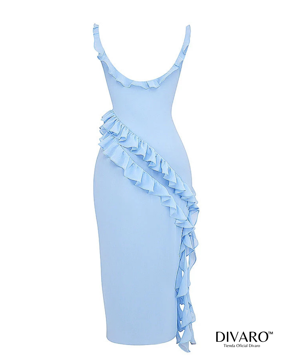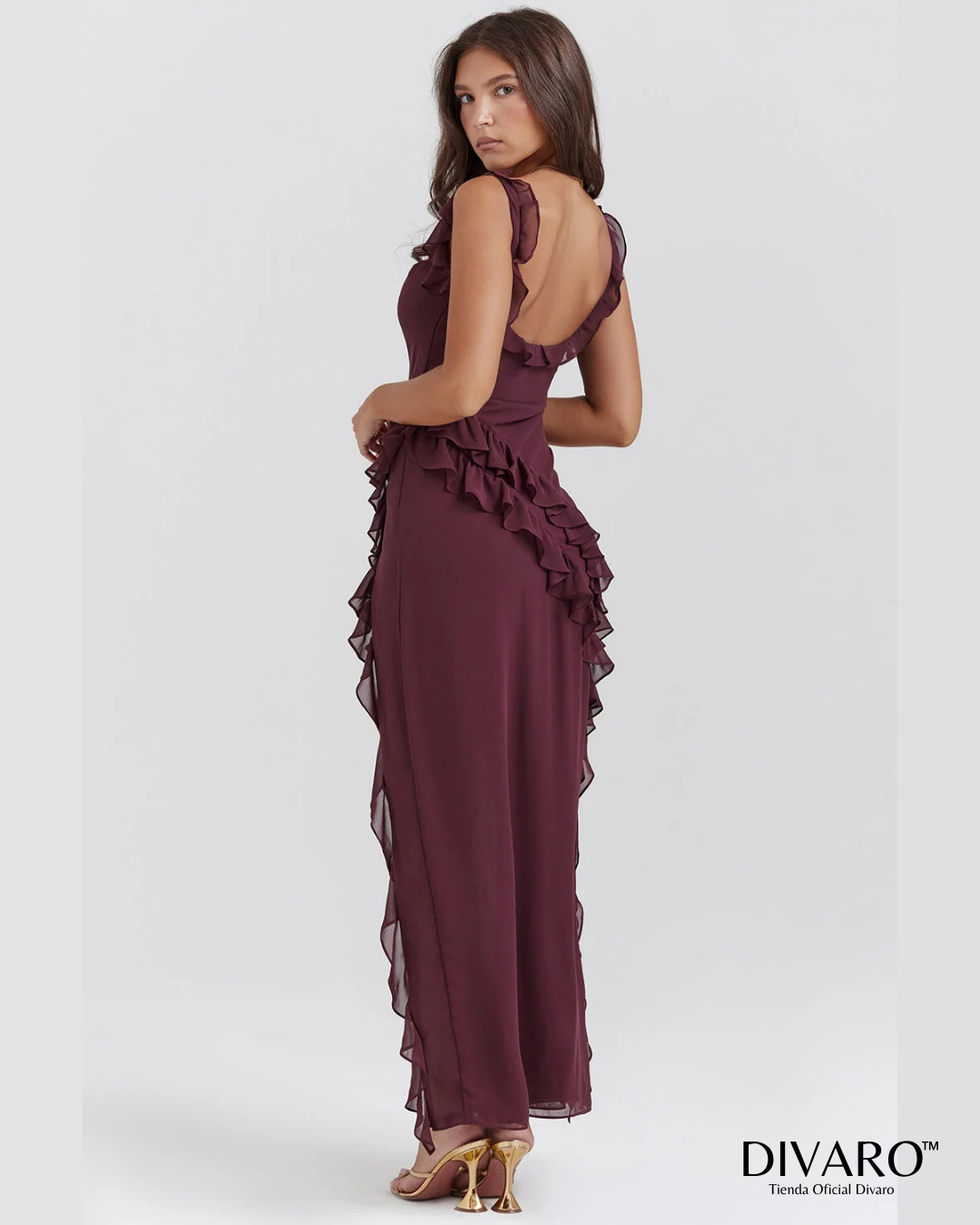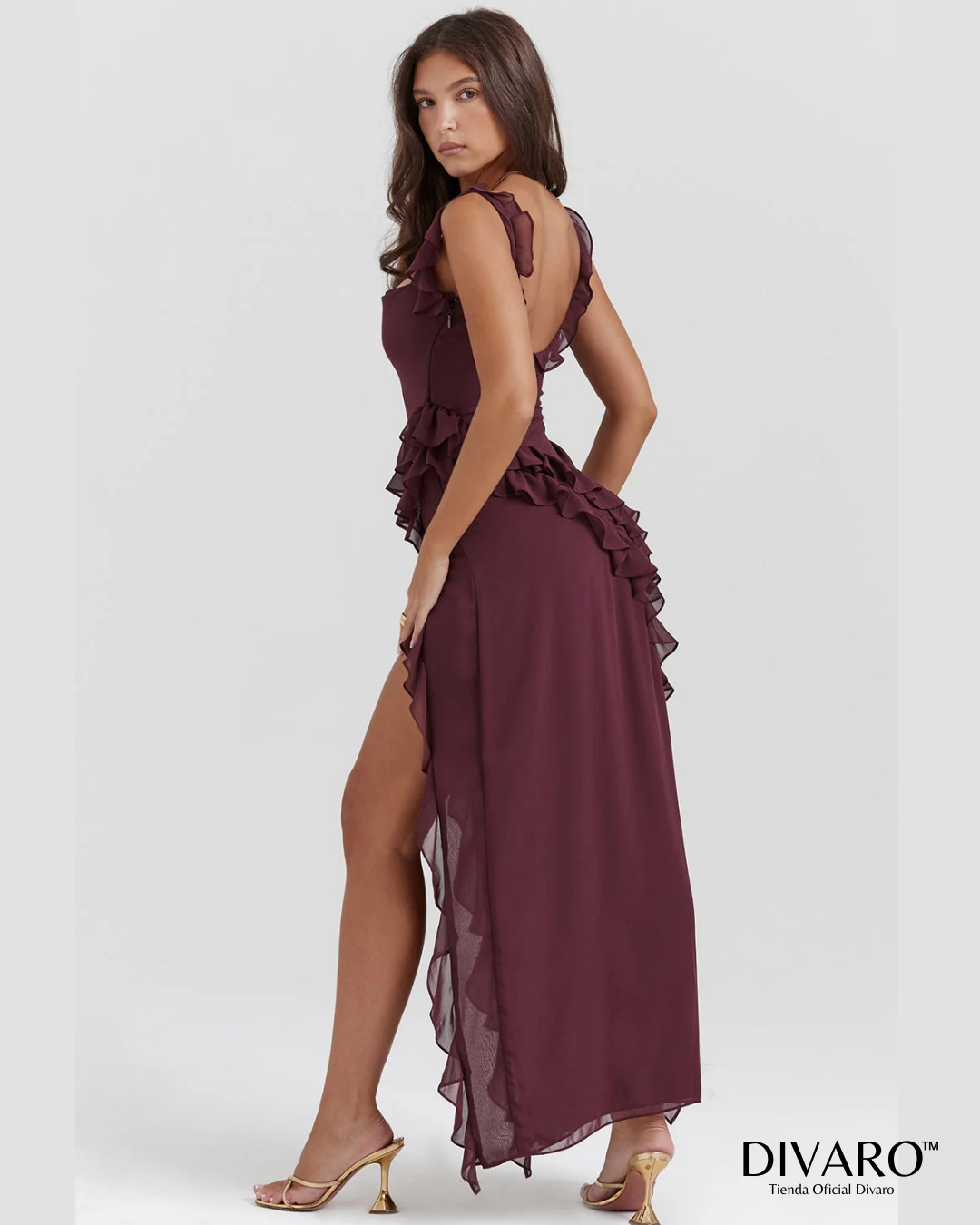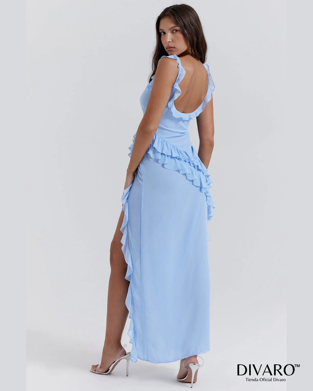 Descubre Elena, nuestro vestido largo con olanes. Su diseño ceñido se ajusta a la perfección a tu figura realzando tus curvas, mientras que los olanes añaden movimiento a tu look.