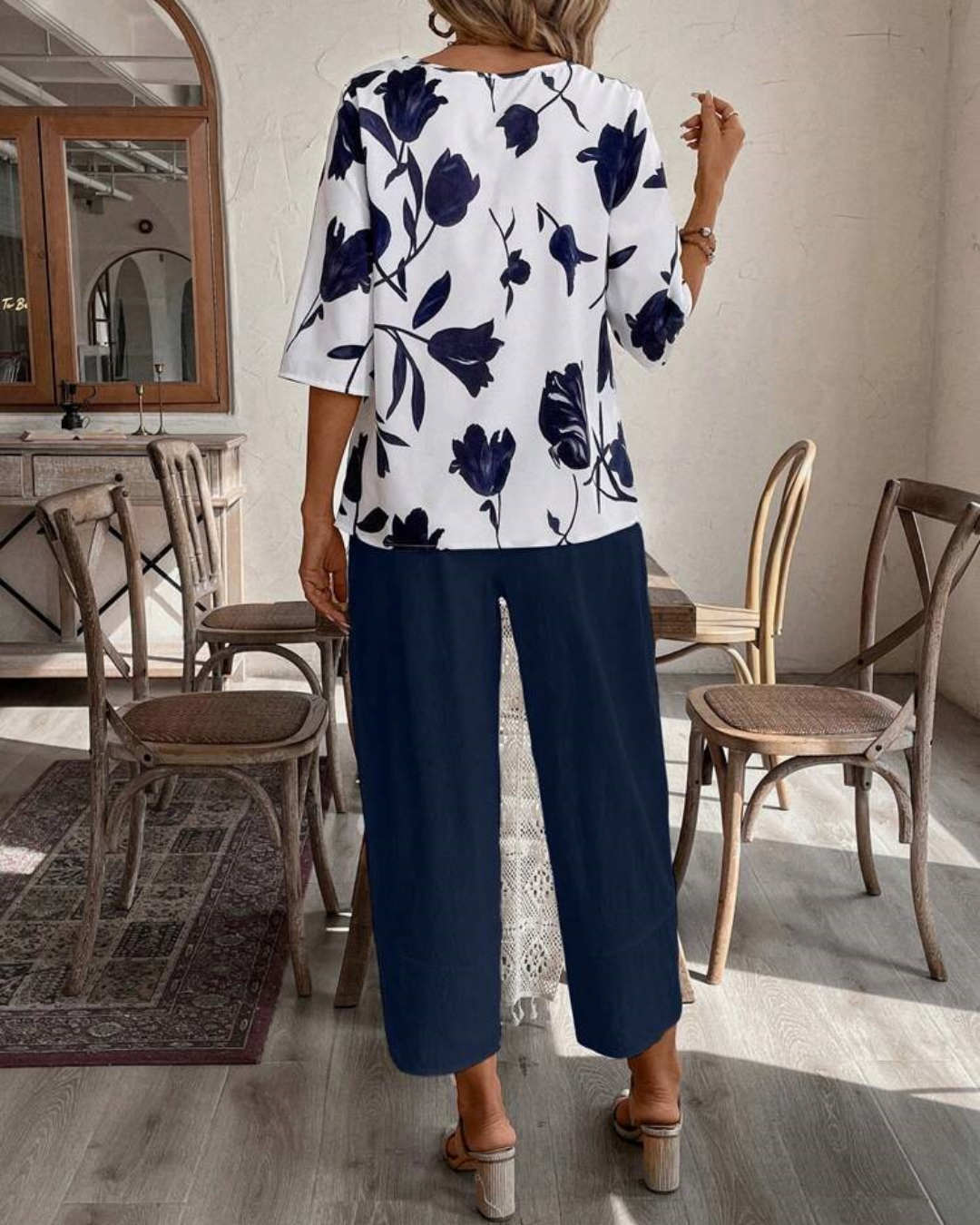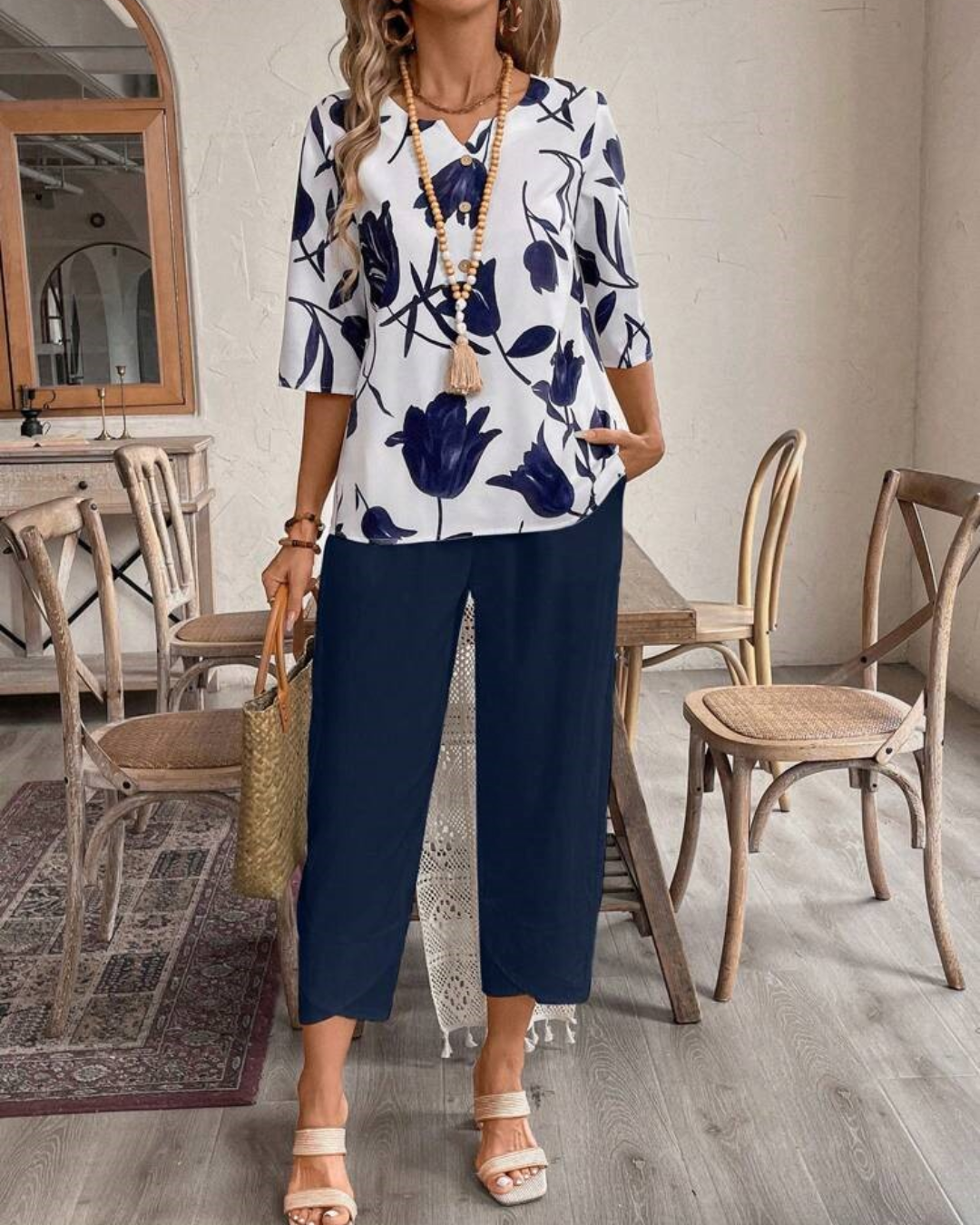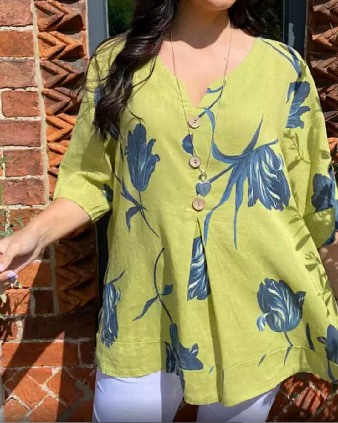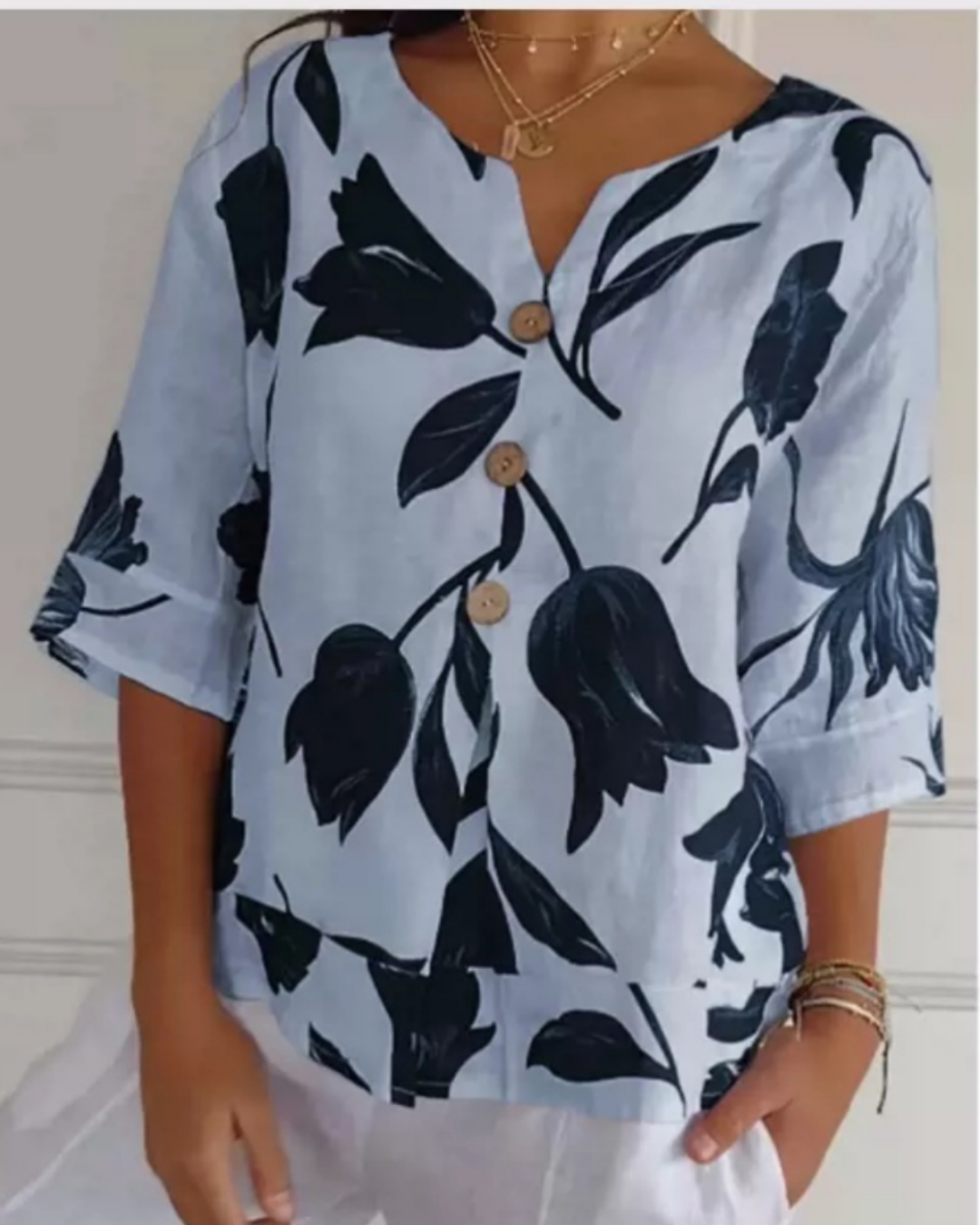 Su diseño con estampado étnico y su cuello en V realzan la feminidad, mientras que su corte holgado la hace ideal para combinar con jeans, faldas o pantalones de lino.