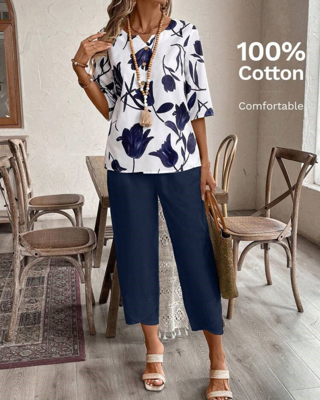 Confeccionada en una mezcla ligera de algodón y poliéster en un pequeño porcentaje, esta blusa es perfecta para los días cálidos gracias a su frescura y comodidad.